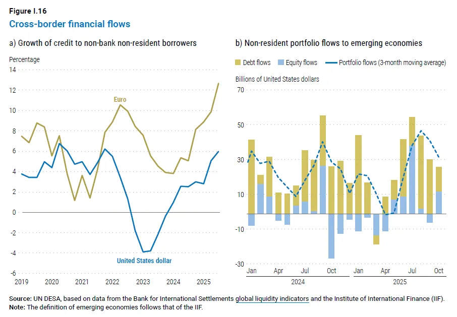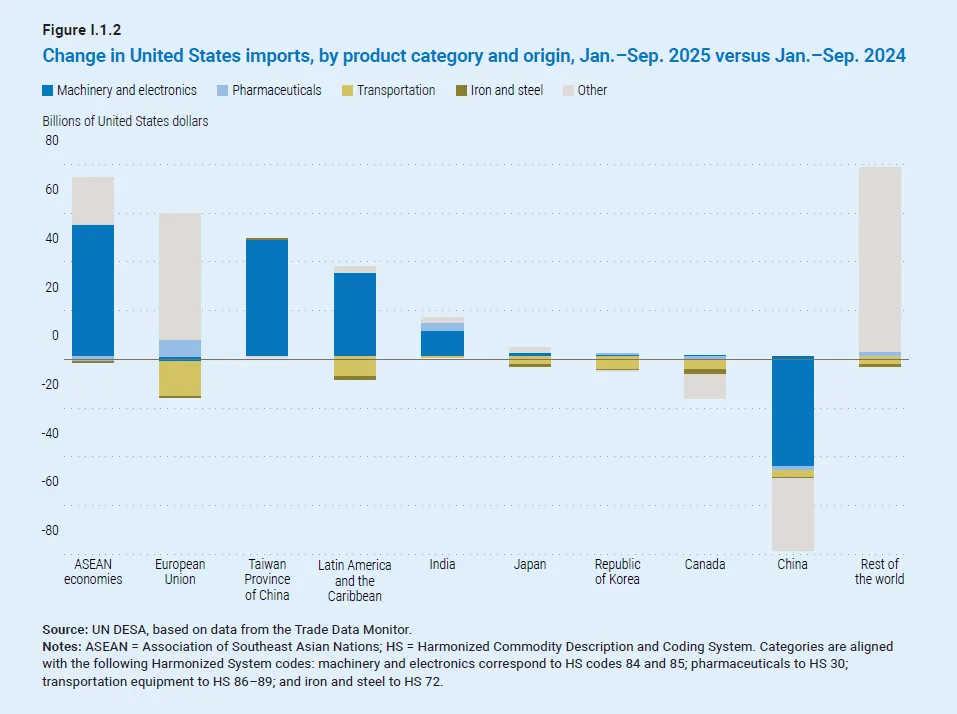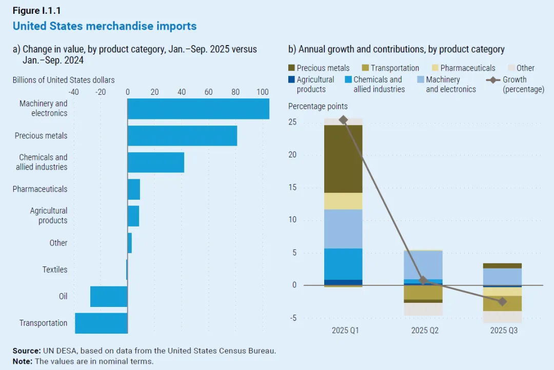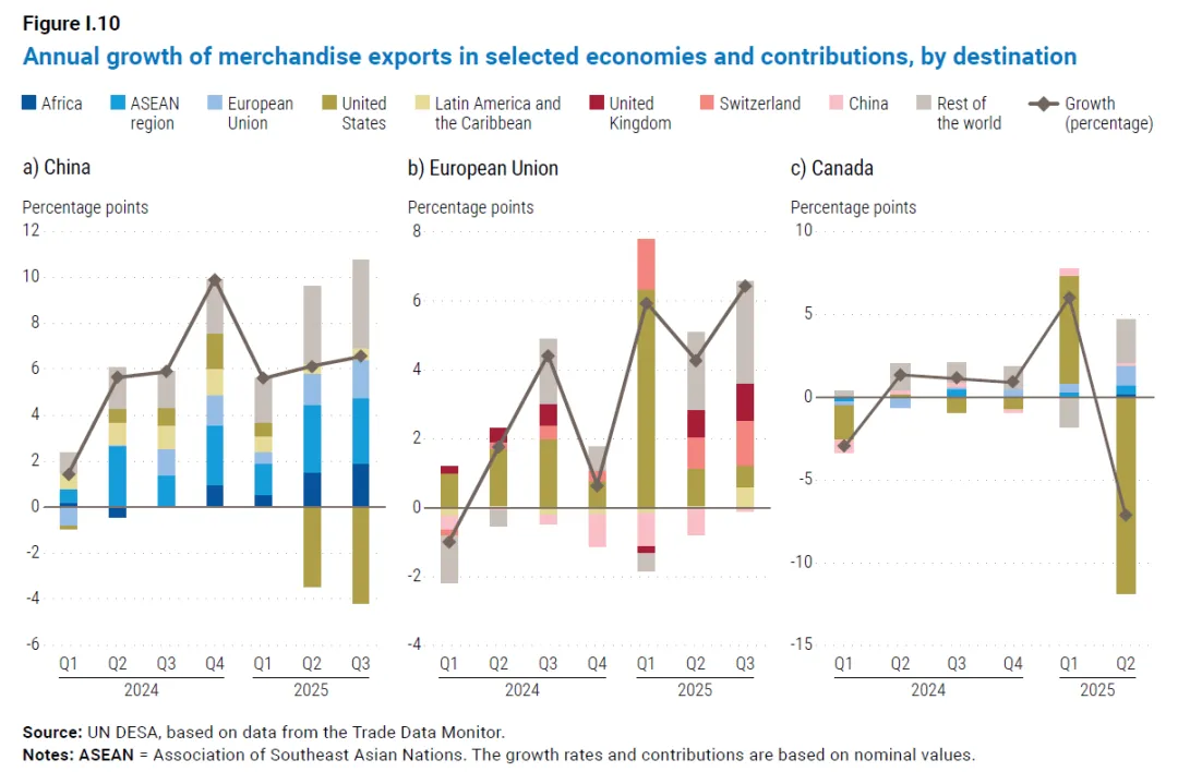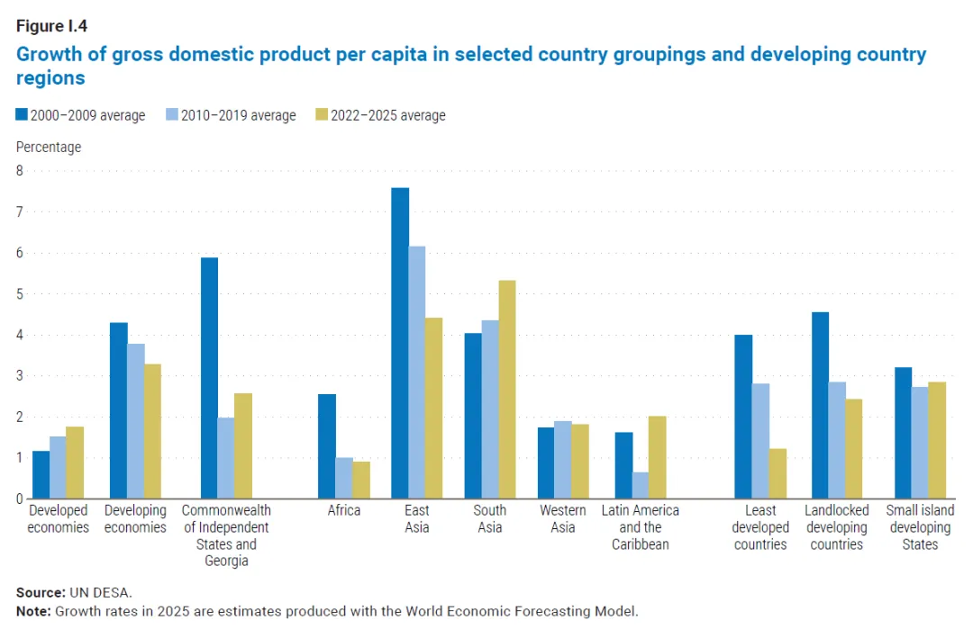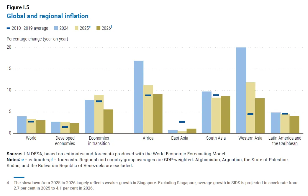 Global economic output is forecast to grow by 2.7 per cent in 2026, slightly below the 2.8 per cent estimated for 2025 and well below the pre-pandemic average of 3.2 per cent.2026 年全球经济产出预计将增长 2.7%,略低于 2025 年预估的 2.8%,且远低于疫情前 3.2% 的平均水平。During 2025, unexpected resilience to sharp increases in U.S. tariffs, supported by solid consumer spending and easing inflation, helped sustain growth. However, underlying weaknesses persist. Subdued investment and limited fiscal space are weighing on economic activity, raising the prospect that the world economy could settle into a persistently slower growth path than in the pre-pandemic era.2025 年,在强劲消费支出与通胀放缓的支撑下,全球经济对美国关税大幅上调展现出超出预期的韧性,助力维持经济增长态势。但经济的深层结构性短板依然存在,投资低迷与财政空间受限正拖累经济活动,全球经济或将陷入比疫情前增速更为缓慢的长期发展轨道。The report notes that a partial easing of trade tensions helped limit disruptions to international commerce. However, the impact of higher tariffs, coupled with elevated macroeconomic uncertainties, is expected to become more evident in 2026. Financial conditions have eased amid monetary loosening and improved sentiment, but risks remain high given stretched valuations—especially in sectors linked to rapid advances in artificial intelligence. Meanwhile, high debt levels and borrowing costs are constraining policy space, especially for many developing economies.报告指出,贸易紧张局势的局部缓和有助于减轻对国际贸易的干扰。但高关税的影响,叠加宏观经济不确定性上升,预计将在 2026 年进一步凸显。随着货币政策宽松落地及市场情绪好转,金融环境已有所改善,但鉴于当前偏高的资产估值,市场风险仍处于高位,人工智能等快速发展的相关领域尤为突出。与此同时,高债务水平与借贷成本正压缩政策调控空间,众多发展中经济体面临的压力更为显著。“A combination of economic, geopolitical and technological tensions is reshaping the global landscape, generating new economic uncertainty and social vulnerabilities,” said United Nations Secretary-General António Guterres. “Many developing economies continue to struggle and, as a result, progress towards the Sustainable Development Goals remains distant for much of the world.”联合国秘书长安东尼奥・古特雷斯表示:“经济、地缘政治与技术领域的多重紧张局势交织,正重塑全球发展格局,催生新的经济不确定性与社会脆弱性。”“许多发展中经济体仍在艰难前行,这导致全球多数地区在实现可持续发展目标的进程中,依然任重道远。”Regional economic outlook: expansion broadly steady, but unevenEconomic growth in the United States is projected at 2.0 per cent in 2026, compared to 1.9 per cent in 2025, supported by monetary and fiscal easing. However, a softening labour market will likely weigh on momentum.在美国货币与财政政策宽松的支撑下,2026 年美国经济增长率预计为 2.0%,略高于 2025 年的 1.9%。但劳动力市场走弱的趋势,或将对经济增长动能形成拖累。In the European Union, economic growth is forecast at 1.3 per cent in 2026, down from 1.5 per cent in 2025, as higher U.S. tariffs and ongoing geopolitical uncertainty dampen exports.受美国加征关税及地缘政治不确定性持续发酵对出口的抑制影响,欧盟 2026 年经济增长率预计为 1.3%,低于 2025 年的 1.5%。Output in Japan is expected to expand by 0.9 per cent in 2026, compared with 1.2 per cent in 2025, with a modest domestic recovery partly offsetting weaker external conditions.日本 2026 年经济产出预计增长 0.9%,低于 2025 年的 1.2%,国内经济温和复苏仅能部分抵消外部环境趋弱带来的负面影响。In the Commonwealth of Independent States and Georgia, growth is projected at 2.1 per cent in 2026, mostly unchanged from 2025, even as the war in Ukraine continues to weigh on macroeconomic conditions.尽管乌克兰局势持续对宏观经济构成压力,但 2026 年独立国家联合体(独联体)及格鲁吉亚的经济增长率预计为 2.1%,与 2025 年基本持平。In East Asia, growth is projected at 4.4 per cent in 2026, down from 4.9 per cent in 2025 as the boost from front-loaded exports fades. China’s economy is expected to grow by 4.6 per cent, slightly lower than in 2025, supported by targeted policy measures.随着前期出口前置带来的增长红利逐步消退,东亚地区 2026 年经济增长率预计为 4.4%,低于 2025 年的 4.9%。在定向政策措施的支撑下,中国经济 2026 年预计增长 4.6%,略低于 2025 年水平。In South Asia, growth is forecast at 5.6 per cent in 2026, easing from 5.9 per cent, led by India’s 6.6 per cent expansion, driven by resilient consumption and substantial public investment.南亚地区 2026 年经济增长率预计为 5.6%,较 2025 年的 5.9% 有所回落。印度将成为区域增长引擎,凭借韧性较强的消费市场与大规模公共投资,其经济增长率预计达 6.6%。In Africa, output is projected to grow by 4.0 per cent in 2026, marginally up from 3.9 per cent in 2025. However, high debt and climate-related shocks pose significant risks.非洲地区 2026 年经济产出预计增长 4.0%,较 2025 年的 3.9% 小幅回升。但高债务负担与气候相关冲击,正给该地区经济带来重大风险隐患。In Western Asia, GDP is expected to grow by 4.1 per cent in 2026, up from 3.4 per cent in 2025, yet the region remains exposed to geopolitical tensions and security risks.西亚地区 2026 年国内生产总值(GDP)预计增长 4.1%,高于 2025 年的 3.4%,但该地区仍面临地缘政治紧张局势与安全风险的持续冲击。In Latin America and the Caribbean, output is ex