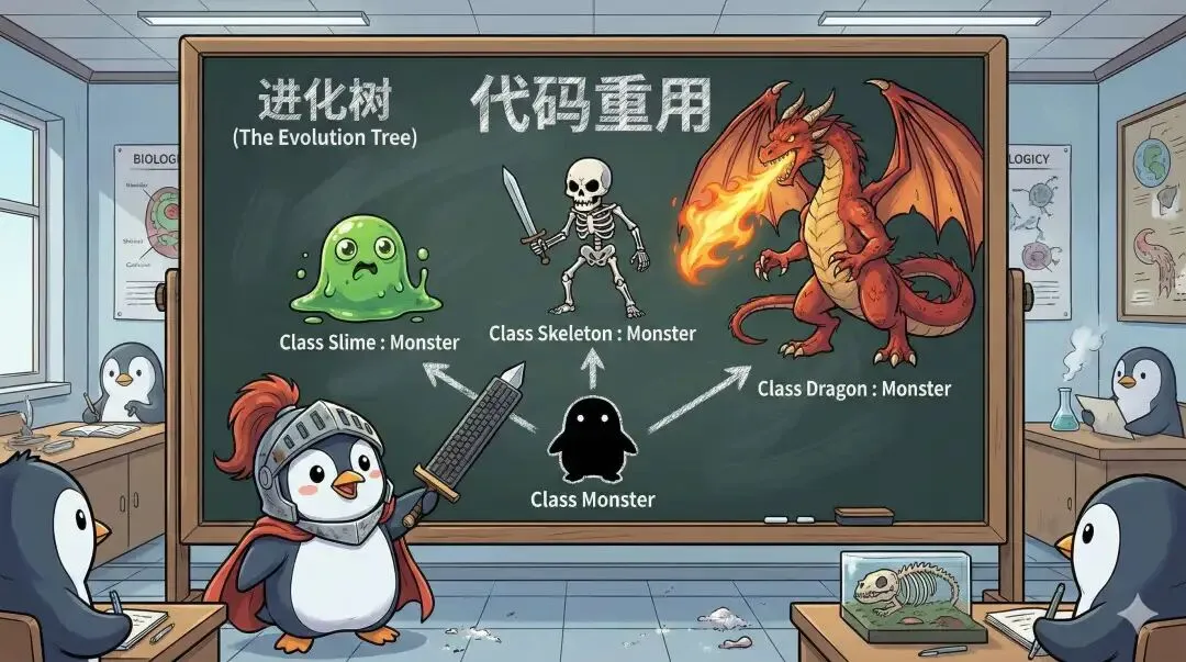Monster)。 - Derived Class (派生类/子类) :继承者 (