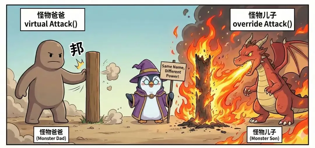 :) :共享代码,减少复制 - Virtual / Override: 父类给默认,子类自由发挥 👉 多态的起点