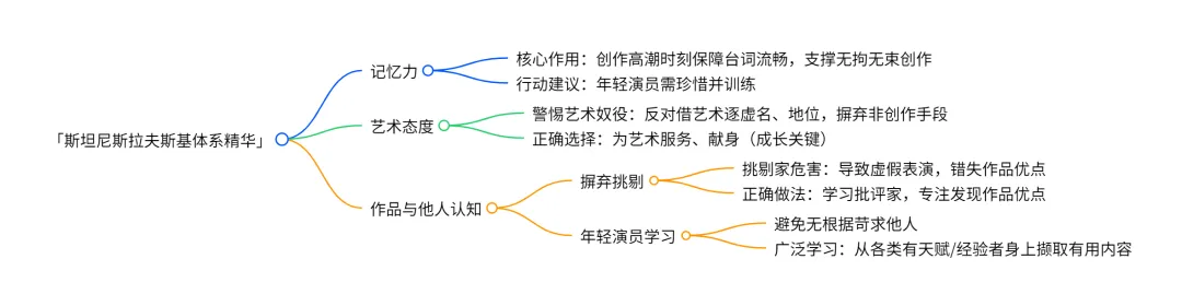 据我看来,年轻的演员从别人那里是有东西可学的。从任何一个只有一点点天赋才能但却有着丰富经验的人那里,都可以得到一些什么。……为了做到这一点,自己就应学会判别和撷取那需要的和重要的东西。(《全集》第3卷,290页)