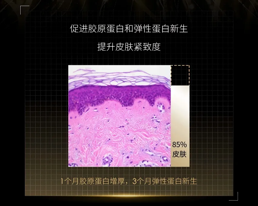 改善肌肤的弹性和紧致度:胶原蛋白纤维网络能够促进细胞合成新的细胞外基质,其中包括|型胶原、Ⅲ 型胶原和弹力蛋白等。免疫组化检测结果表明,经过1个月和 3个月的使用后,弹力蛋白的含量有所增加。