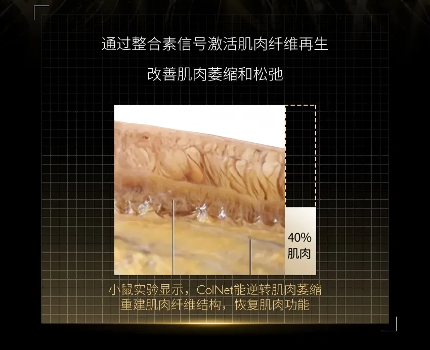 CoINet通过向肌肉层提供高活性、高 效能的胶原蛋白,能够促进肌肉细胞的再生和修复优化肌肉内部的胶原纤维网状结构。