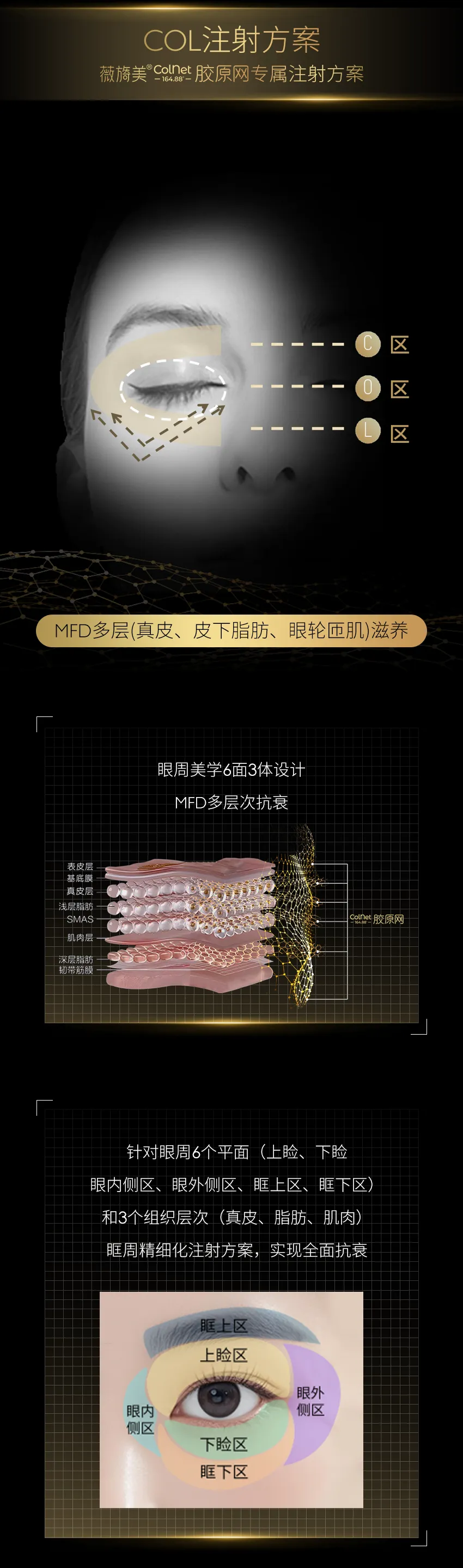 精准修复不同组织层次:采用多层次补充技术(MFD),针对真皮、皮下脂肪以及眼轮匝肌等不同组织层次的胶原蛋白含量和衰老程度,进行精准的修复。具体内容如下: