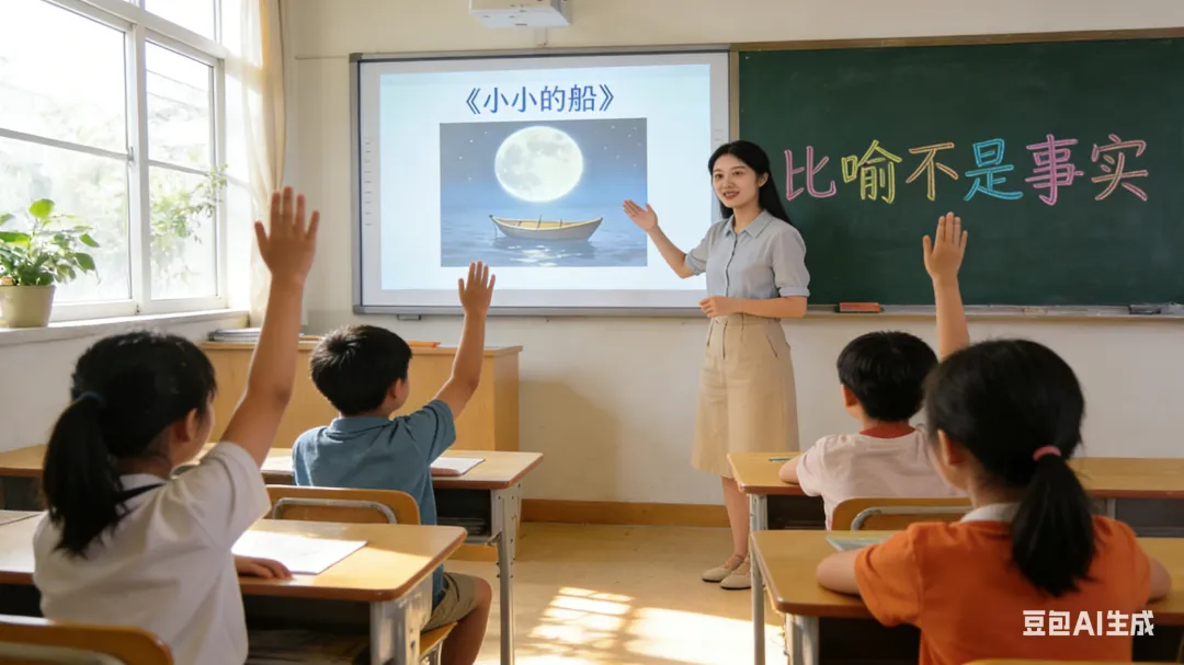 总结话术:“原来这是作者用的‘比喻’手法,能让句子变得更生动、更好听。但我们要记住,比喻出来的东西不是真实的事实哦——这就是带着思考读课文的样子!”