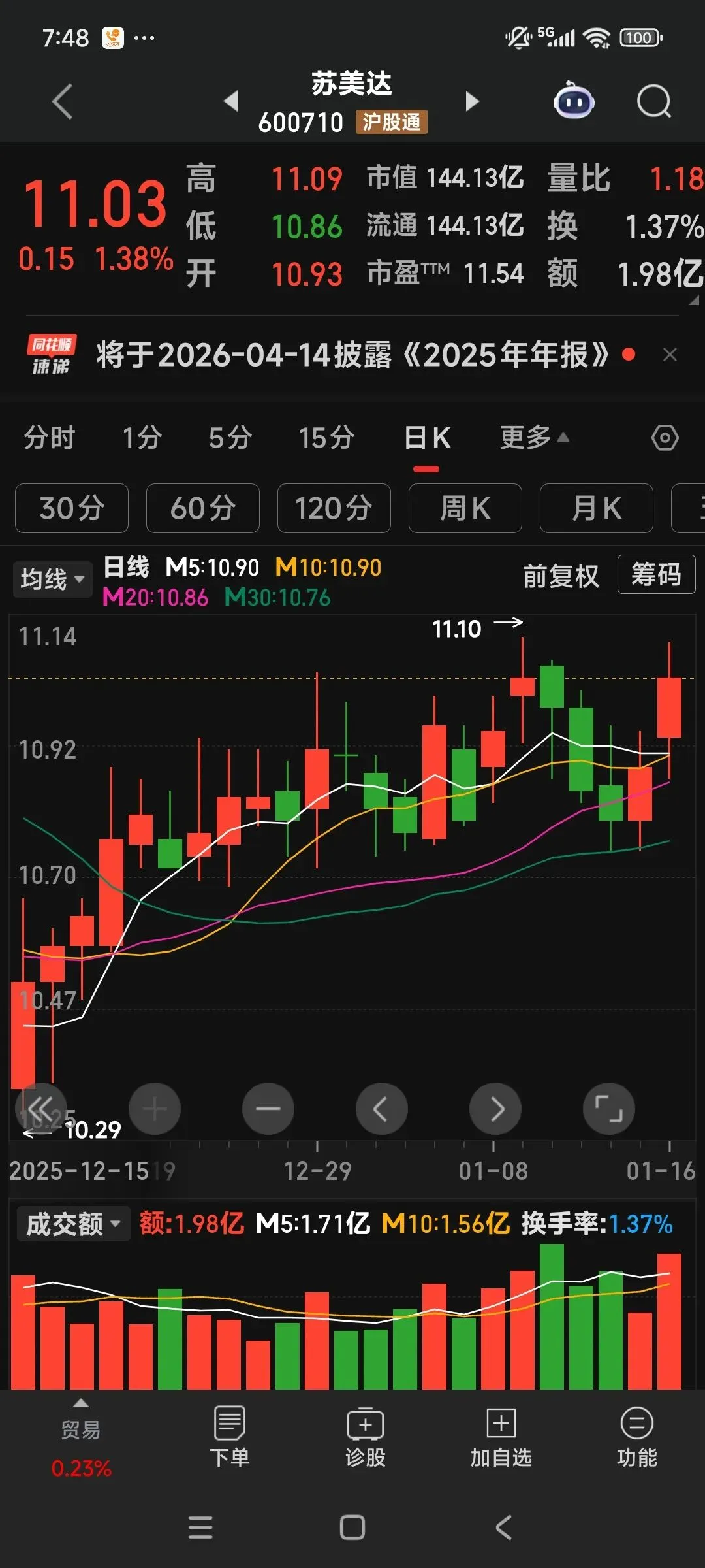 趋势: 明显的上升趋势。M5 > M10 > M20,均线呈多头排列,且股价站在所有均线之上。今日表现: 价格在11.03,上涨1.38%。最关键的是量比 1.18,换手率 1.37%。位置: 股价处于近期的相对高位(11.10附近有压力),但还未破位。