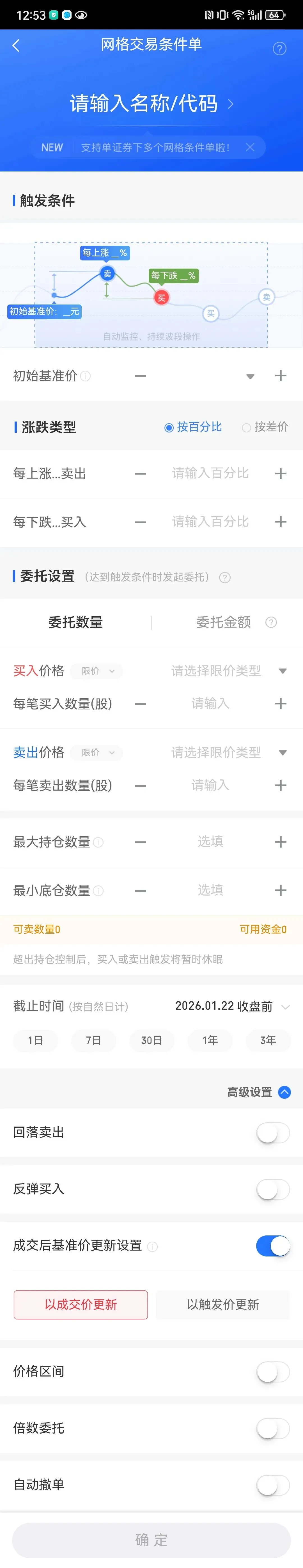 1、各券商提供的网格交易界面差不多,几个关键点是:名称、上下网比例、买卖数量等。上下网比例与买卖数量关系紧密,决定了你的仓位分配,网格小,每笔数量大就很容易买满仓或卖空仓。