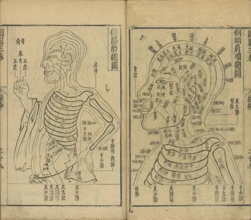 足阳明有挟鼻入于面者,名曰悬颅。属口,对入系目本,头痛,引颔取之,视有过者取之。损有余,益不足,反者益甚。(足阳明胃脉挟鼻经过面部,路线经过了足少阳的悬颅,下行属于口,上行入目系。不管是口病或者是目病,皆可以视情况而取之。)
