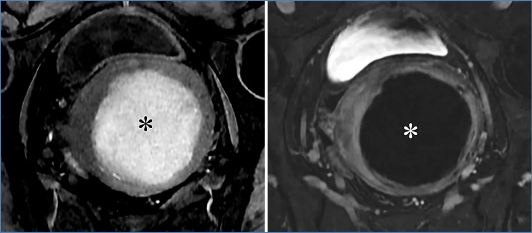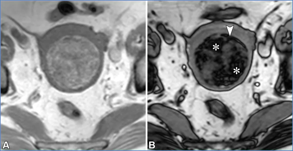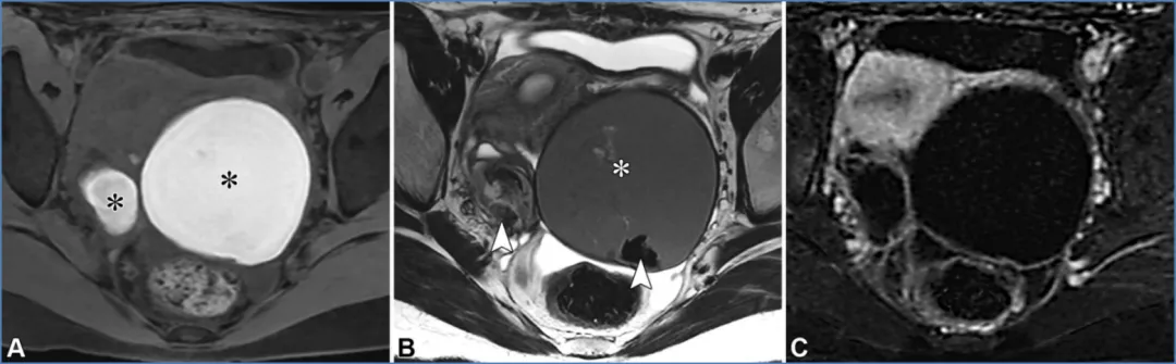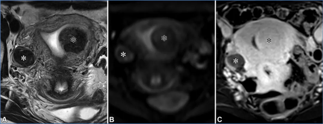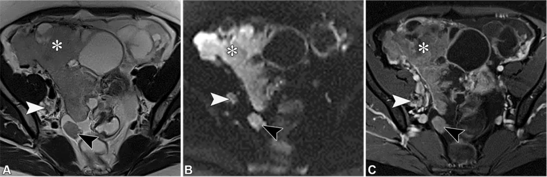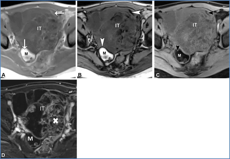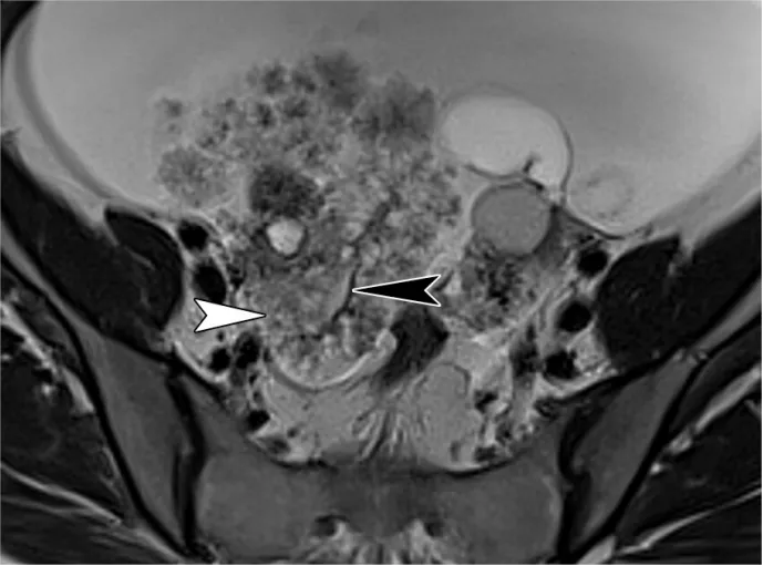 注 ——AFP = 甲胎蛋白,β-hCG=β- 人绒毛膜促性腺激素,CA-125 = 癌抗原 125,CA19-9 = 糖类抗原 19-9,CEA = 癌胚抗原,HE-4 = 人附睾蛋白 4,LDH = 乳酸脱氢酶。*CA-125/CEA 比值大于 25 时,更倾向于诊断为原发性黏液性卵巢恶性肿瘤;而比值等于或小于 25 时,则提示需要进行胃肠道检查,包括上下消化道内镜检查,以排除源自胃肠道原发肿瘤的卵巢黏液性转移瘤。描述病灶特征首先要识别正常结构和可能的起源,这需要结合临床病史。首先找到卵巢和子宫。提示卵巢起源的线索包括:同侧正常卵巢缺失(“幻影器官”征);卵巢组织围绕肿块,其外侧边缘形成锐角(“鸟嘴”征);变形的新月形卵巢与肿块相邻(“嵌入器官”征);以及性腺血管供应(“卵巢血管蒂”征)(图17)(56,57)。卵巢血管蒂征在卵巢轴面或与子宫体平行的斜冠状面显示最佳(图2、3)。管状形态提示输卵管起源。图17. 提示病变起源于卵巢的影像学线索。(A)一位31岁女性患者的冠状位T2加权图像,该患者患有多囊卵巢综合征、子宫内膜腺癌(未显示)和左侧卵巢转移瘤,图像显示一个变形的新月形卵巢(白色虚线轮廓)紧邻病变(嵌入器官征)。注意卵巢组织与病变接触处的侧缘形成锐角,符合喙征(箭头)。(B)一位69岁女性结肠癌卵巢转移患者的矢状位T2加权图像,显示正常同侧卵巢缺失(幻影器官征),且存在性腺血管供应(卵巢血管蒂征,箭头)。卵巢血管蒂征在沿子宫体平行获取的卵巢轴位或冠状斜位图像(未显示)上显示最佳。提示病灶起源于子宫的征象包括:子宫组织包绕肿块并在其两侧形成锐角(即 “爪征”);对于带蒂肿块,可见从子宫延伸至肿块的组织蒂和(或)血管(即 “桥接组织 / 血管征”)(图 18)(56,57)。上述的爪征和喙征均提示病变起源于某个器官,而非仅仅与其相邻,其依据是器官边缘被牵拉形成锐角,其中爪征通常更为明显。尽管这两种征象在影像学表现上相似,但 “喙征” 用于提示卵巢起源,而 “爪征” 则用于提示子宫起源(57,58)。图18. 提示病变起源于子宫的影像学线索。一位37岁女性患者的轴位斜向T2加权图像显示,肿块(平滑肌瘤)周围有子宫组织,伴有锐利的侧缘(爪征,虚线),以及从子宫延伸至肿块的血管(桥接血管征,箭头)。其他线索包括邻近结构的移位(28)。子宫和直肠乙状结肠的后移或侧移,或子宫前移与直肠后移,提示肿物起源于腹腔内。腹膜外器官的前移或中央移位提示肿物起源于腹膜外。输尿管和髂血管的中央移位提示肿物起源于盆腔侧壁,而肛提肌的上移则提示肿物起源于会阴部。一旦确定了可能的病灶起源,评估组织成分和实性组织形态就能提供有价值的见解(59)。教学要点 系统回顾同相位、反相位和脂肪饱和T1加权图像以评估脂质与血液含量,随后回顾T2加权和增强图像,根据后两者中实性组织的存在来区分囊肿与囊性及实性病灶,同时结合弥散加权图像和表观扩散系数(ADC)图的评估,可将病灶分为五类:(d)具有T2低信号/DWI低信号实性组织的囊性或实性病灶;(e)具有非T2低信号/非DWI低信号实性组织的囊性或实性病灶。 若T1信号强度与尿液或脑脊液(CSF)相似,则为低信号;若T2信号强度与骨骼肌相同或更低,则为低信号或暗信号;对于附件病灶,高b值弥散加权信号强度若与尿液或脑脊液相似,则为低信号或暗信号;若更高,则为高信号(19)。对于子宫病灶,高b值弥散加权信号强度若低于子宫肌层,则为低信号或暗信号;图19. 一名28岁女性患者的右侧成熟畸胎瘤和左侧未成熟畸胎瘤。这两个病灶都含有脂质,但成熟畸胎瘤(M)通常表现为充满脂质的囊肿,而未成熟畸胎瘤(IT)是复杂的多房囊性肿块,伴有强化的实性组织和散在的小脂质灶。肉眼可见的脂肪可通过以下特征识别:在轴位同相位T1加权图像上呈高信号(A中的箭头),在轴位反相位T1加权图像上的脂肪-水界面存在印度墨汁伪影(黑色边界伪影)(B中的箭头),以及在轴位脂肪抑制T1加权图像上信号被抑制(C中的箭头)。与成熟畸胎瘤可能在罗基坦斯基结节中显示强化不同,未成熟畸胎瘤在增强成像时显示大量强化的实性组织(白色X),如轴位减影图像(D)所示。图20. 一位65岁女性患者的脂肪平滑肌瘤。(A)轴位同相位T1加权像显示子宫肌层内有一个边界清晰的高信号肿块。(B)轴位反相位T1加权像显示有印度墨汁伪影(黑色边界伪影,箭头所示)以及病灶内的信号降低(*),证实存在肉眼可见的脂肪和微观脂肪。对于卵巢来源的病变,最常见的诊断是成熟畸胎瘤(皮样囊肿),这是一种良性卵巢生殖细胞肿瘤(62)。成熟畸胎瘤通常无症状,但可能会引起扭转相关的疼痛。它们通常表现为囊肿,主要含有肉眼可见的脂质、偶尔可见的镜下脂质、毛发、皮肤成分以及牙齿样钙化(在T1和T2加权像上呈低信号)。它们可能会有弥散受限,还可能包含强化的罗基坦斯基结节,但这些都不是恶性的迹象(图19)(19,57,60,61)。极少情况下,含脂质的病变可能是恶性的。在老年患者中,成熟畸胎瘤可能发生恶性转化(≤2%),通常会转化为鳞状细胞癌;一个关键的影像学特征是较大的实体组织,常伴有跨壁延伸(19,62)。30岁以下女性可能会出现未成熟畸胎瘤,这是一种恶性卵巢生殖细胞肿瘤,常伴有血清甲胎蛋白和乳酸脱氢酶水平升高。未成熟畸胎瘤表现为大型单侧囊性病变,伴有实体组织、散在的小脂质灶以及不规则的小钙化,这些在MRI上可能难以检测到(图19)(62,63)。非附件病变。对于子宫来源的病变,脂肪平滑肌瘤