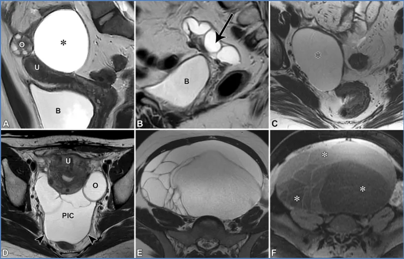 - 卵巢功能性囊肿:绝经前常见,直径≤3cm,多为单侧,出血性囊肿信号随出血时间变化,2-3 个月可自行消失,与子宫内膜异位囊肿(多双侧、持续存在、T2 壁更厚)鉴别。