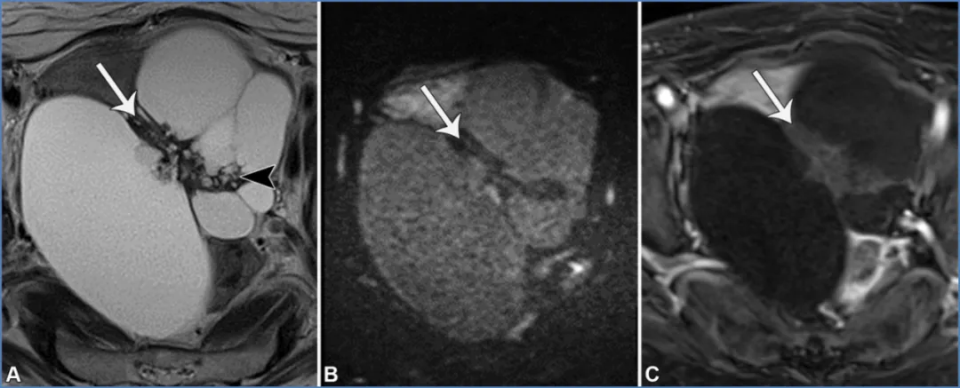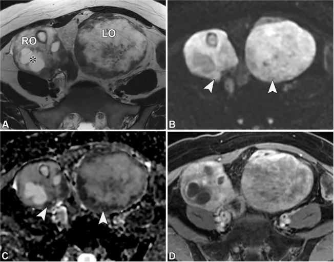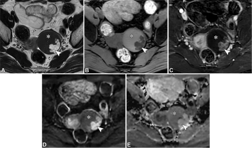 - 卵巢恶性肿瘤:高级别浆液性癌多为双侧囊实性病灶,伴大量 T2 非低信号 / DWI 非低信号实性成分、腹膜种植、腹水及淋巴结肿大;无性细胞瘤好发于<30 岁女性,为单侧实性病灶,T2 等信号,由 T2 低信号纤维血管间隔分隔成小叶,伴 LDH 升高;转移性卵巢癌(如库肯勃瘤)多为双侧快速增大的囊实性病灶,实性成分 T2 非低信号 / DWI 非低信号,常来自胃肠道腺癌。
