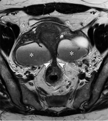 - 子宫内膜异位症:子宫内膜异位囊肿多为双侧、T1 高信号、T2 “阴影征”(信号降低),伴纤维性 T2 低信号壁;深部子宫内膜异位症表现为 T2 低信号 / DWI 低信号结节,常累及宫骶韧带、直肠乙状结肠等,可导致 “卵巢接吻征”(卵巢被瘢痕牵拉至子宫后方)。