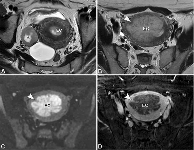 - 子宫内膜癌:T2 等信号子宫内膜肿块,伴肌层浸润(肿瘤 - 肌层界面中断),DWI 弥散受限,增强扫描强化弱于肌层;需评估肌层浸润深度、宫颈间质侵犯及淋巴结转移。
