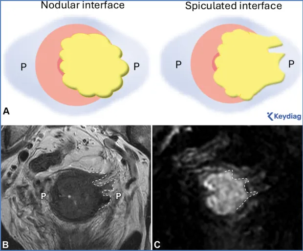 - 宫颈癌:宫颈区 T2 等信号实性病灶,侵犯宫颈间质(正常 T2 低信号宫颈间质中断), parametrial 侵犯表现为肿瘤与宫旁组织间结节状 / 毛刺状界面;DWI 可提高宫旁侵犯诊断准确性。