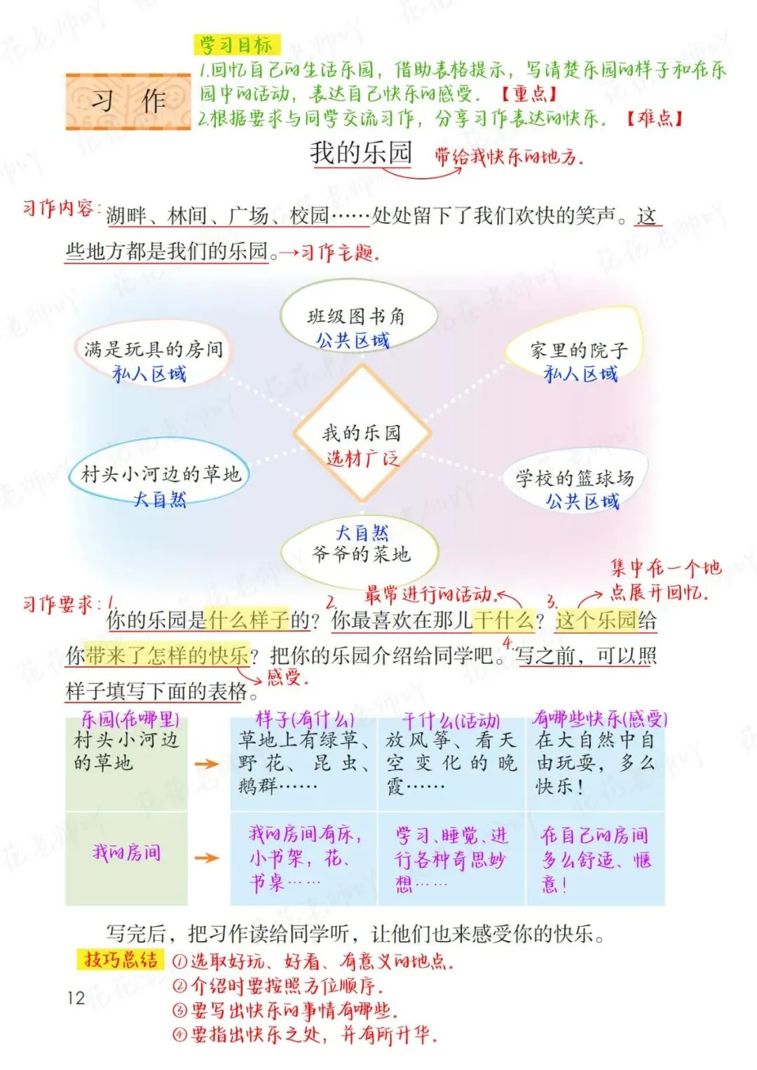 1.回忆自己的生活乐园,借助表格提示,写清楚乐园的样子和在乐园中的活动,表达自己快乐的感受。