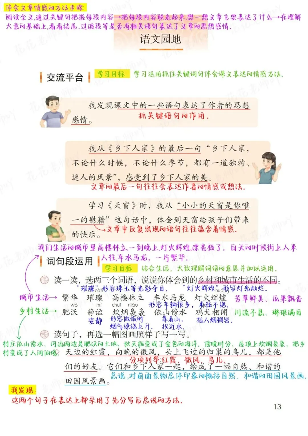 “交流平台”引导学生交流在阅读时能从关键语句初步体会课文的思想感情。教材分别以《乡下人家》的结尾,《天窗》的过渡句为例,说明了阅读课文时要留心特别能够达作者情感或想法的语句。编排这部分内容,意在引导学生通过回顾本单元所学课文,发现这一类课文的共性特点,巩固习得的“抓关键语句,初步体会课文思想感情”的阅证法,并在以后的阅读中能灵活运用。
