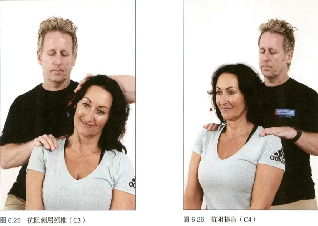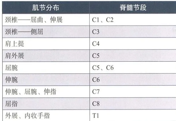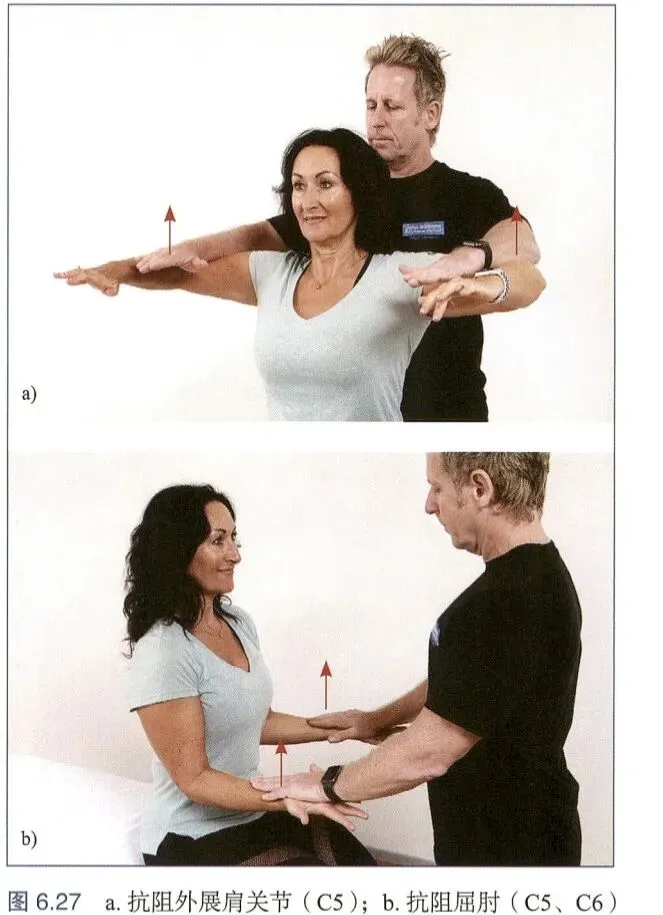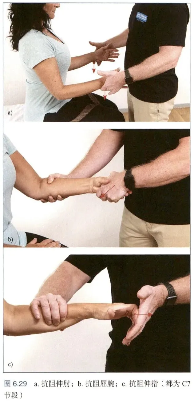 我们会要求患者收缩某组肌肉以评估相应肌节的功能,且评估者的力量要大于患者该肌群的肌力。在肌力测试中发现的任何肌力下降都可能预示着相应神经根存在问题。