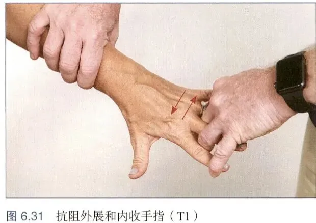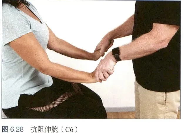 患者坐位,治疗师一手置于患者前额施以阻力,嘱患者抗阻屈曲颈椎(图6.24a)。治疗师一手置于患者枕骨施以阻力,嘱者抗阻后伸颈椎(图6.24b)。患者坐位,治疗师一手置于患者前额外侧方施以阻力,嘱患者抗阻侧屈颈椎(图6.25)。患者坐位,治疗师一手置于患者肩部施以向下的阻力,嘱患者抗阻上提肩带(图6.26)。患者坐位,外展肩关节(或一次一侧)至90。治疗师将手置于患者肘关节,嘱患者抗阻外展肩关节(图6.27a)。然后,患者屈曲肘关节至90°,治疗师将手置于患者前臂远端,嘱患者抗阻屈曲肘关节(图6.27b)。屈肘已如图6.27所示,故此处仅嘱患者屈肘90°,前臂旋前。治疗师将手置于腕关节上,嘱患抗阻伸腕(图6.28)。患者坐位,屈肘90°。治疗师将手置于前臂远端尺侧,嘱患者抗阻伸肘(图6.29a)。然后,嘱患者抗阻屈腕(图6.29b)。最后,嘱患者抗阻伸指(图6.29c)。患者坐位,治疗师手指与患者手指交叉,并锁住患者手指,嘱患者抗阻内收、外展手指(图6.31)。二、上肢腱反射检查
