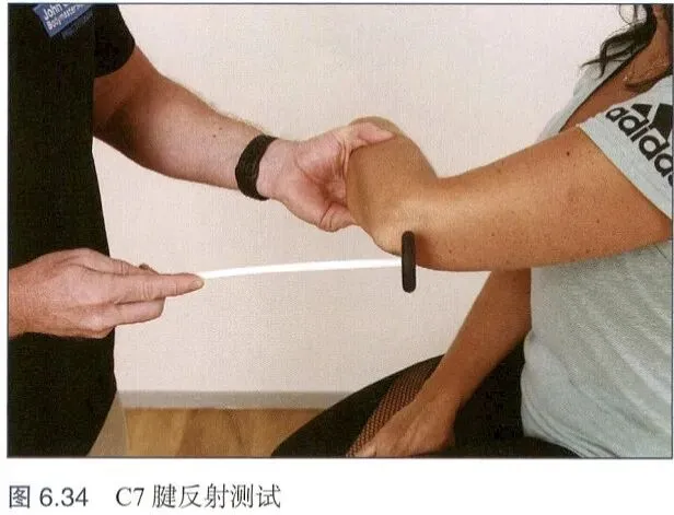 肱三头肌腱反射(C7):嘱患者放松上臂,治疗师一手于患者胸前或下腹前侧轻握其手腕。在肘关节后上方,轻敲肱三头肌腱引发腱反射(图6.34)。