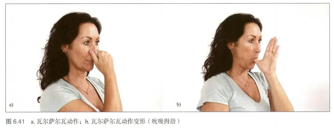 该动作用于测试颈椎和神经问题,能够增加颈椎压力,任何占位性病变都会因压力上升而症状加重,如椎间盘脱出引起的神经痛。下图a展示了捏住鼻子并尝试向外鼓气来平衡耳内压力,图b展示了另一种方法,吸吮拇指或往拇指外吹气。
