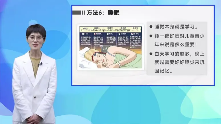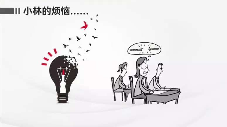 接下来我们来看第四部分,脑科学视角下的高效学习法,还是从一个案例开始。小林是一名初三的女生,临近中考,复习时间紧张,压力也比较大。所以考试前这段时间他经常熬夜,因为睡得比较晚,也导致小林早上经常睡不醒,总是匆匆忙忙准备去上学,早餐也往往吃几口应付了事,白天几乎所有的时间都排得满满当当,可想而知,小林平时根本没有运动锻炼的时间,好在小林对功课的认真态度和努力付出都没有白费。