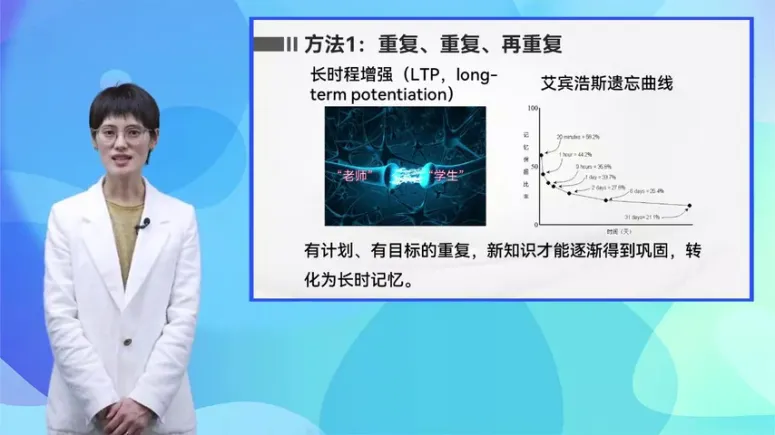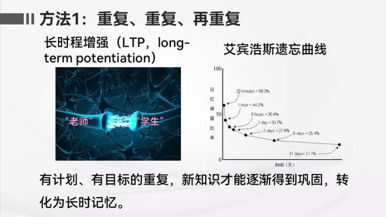 但如果老师只完成一次传导之后,就不再给学生加固信息,那么之前短暂形成的联系很快就会消失,学生就会回归到清零的状态,接收其他可能传过来的信息。所以想要学生把短暂的反应转变成长期的反应,就需要老师在接下来的时间里,间隔性的多次向学生传递信息,对于课堂上的学习也是如此重复,特别是刚刚学完新知识之后的重复是非常重要的。以一天为单位,如果学生在课堂上学习了新的知识,那么最好在之后90分钟时能够再对这些知识进行重复,以一周为单位,则需要把新知识在学习之后的第三天或第四天作为复习知识的时间,随着有计划有目标的重复,新知识才能逐渐得到巩固,转化为常识记忆。
