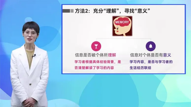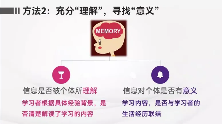 第二个方法是充分理解寻找意义,研究发现长时记忆的形成和两个重要的因素有关,一个是理解,一个是有意义。我们都知道准确理解所学的知识,明白所学知识的含义,是记住这些知识的基础,想象一下,如果儿童青少年对于课堂教师讲授的知识一知半解,只能靠死记硬背去记忆,可想而知,即使能够背下来,记忆的效果也无法长时间保持。那么是否只要理解了所学习的知识点,遗忘就不会发生了。