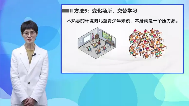 我们也可以提醒家长,在家里可以鼓励儿童青少年在不同的房间学习,或者不时的改变房间的布置。当然教师在教室里也可以经常变动学生的座位,让学生有机会坐在教室前后左右的不同位置。此外,变换不仅可以发生在学习场所上,还需要发生在学习的内容和方式上,内容上的变化既可以是不同学科之间的交替学习,也可以是一门学科不同题型之间的交替练习。比如把语文、数学和物理三门学科的内容进行等分,之后在周一周三和周五三天都完成三门学科相应的复习内容,这种方式比集中复习,比如周一复习语文,周三复习数学,周五复习物理,效果会更好。
