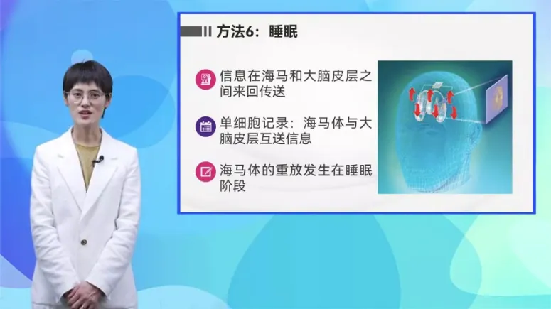 最后想要强调的是睡眠,我们知道记忆的形成需要海马体对信息进行加工,那些最终转化为长时记忆的信息会先在海马体中存储,在这期间海马体会重复将信息送到大脑皮层,每一次重复演练都会使大脑皮层的感受更深刻。在海马体细胞上所做的单细胞记录发现海马体的重新载波是在睡眠时发生的,它们似乎和大脑皮层细胞一直都在做对话,彼此之间一直在传送信息,好像在问答对话这个互相传送信息的过程被脑科学家称之为固化,固化,让慢慢浮动的印象变成常识记忆。