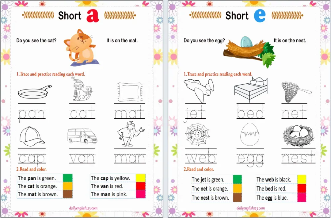 今天分享2套长短元音课件、还有10页练习和10页阅读,下面是部分内容展示!