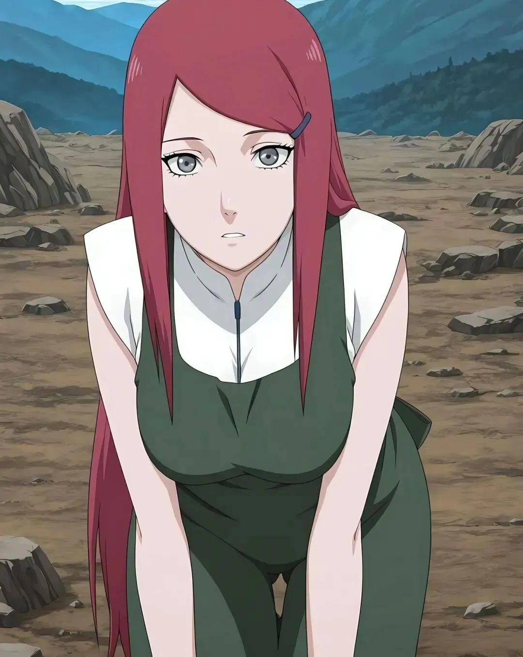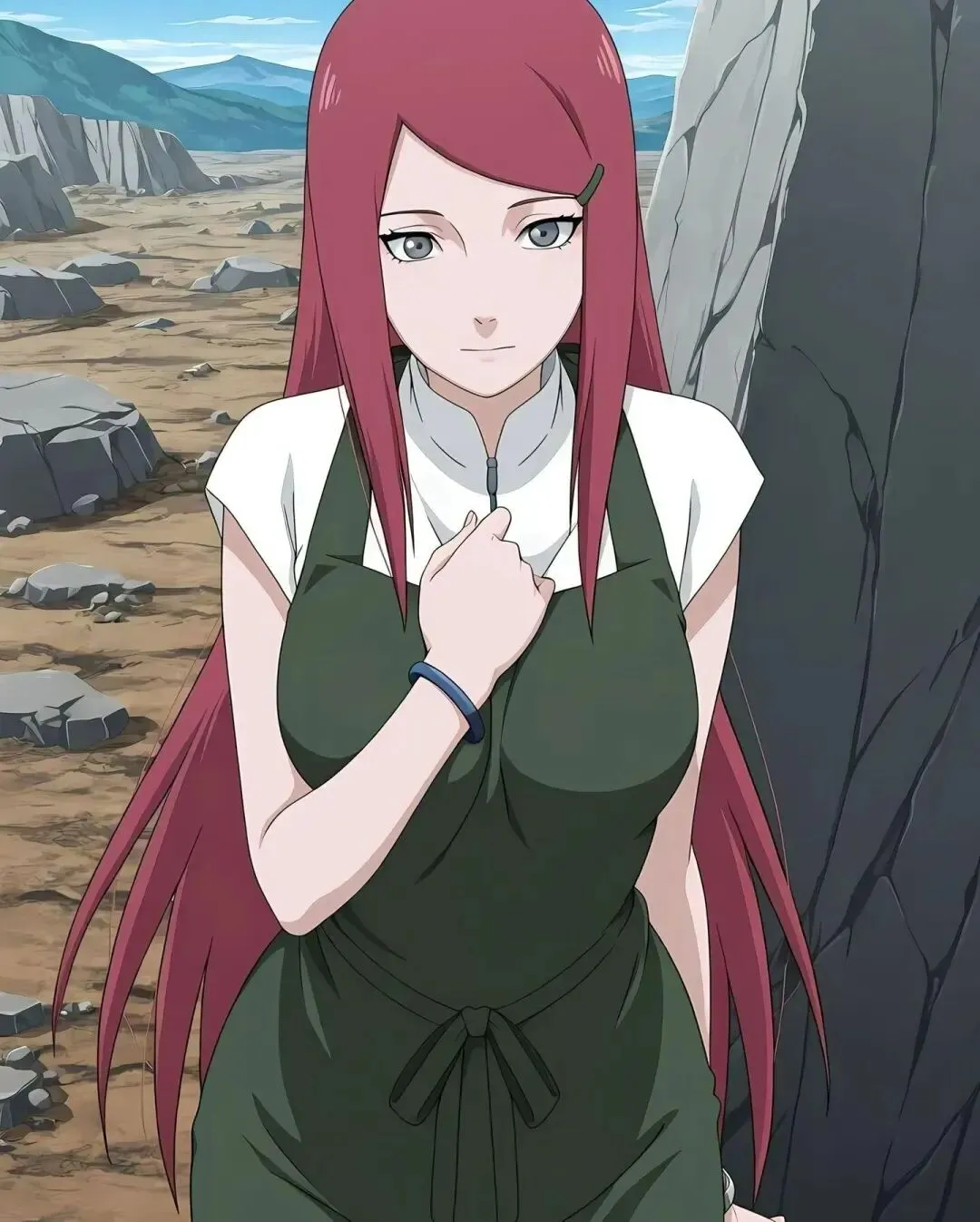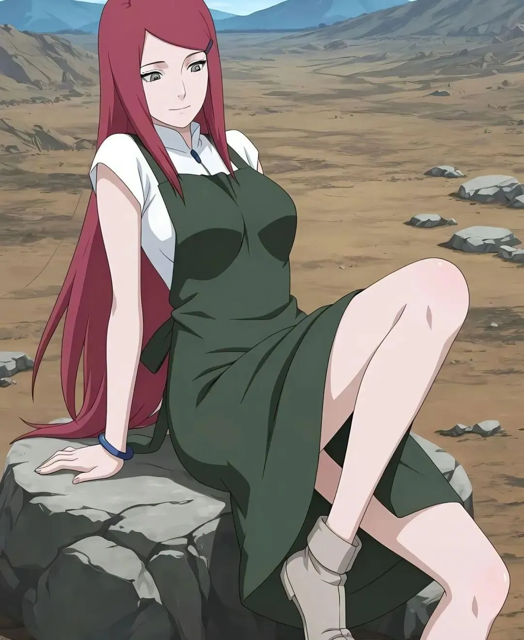 标志性的绯红色长发如同燃烧的火焰,张扬又耀眼,即便在战场的疲惫中,依旧透着蓬勃的生命力;眼眸明亮如炬,平日里满是果敢与直率,此刻却带着一丝卸下防备的柔和,仿佛能看透她内心的坚韧与温柔;一身经典的忍者劲装,贴合身形却不失利落,战斗留下的些许痕迹非但没有减损美感,反而更添几分飒爽,完美诠释了“战场玫瑰”的独特魅力。