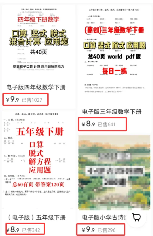 小学阶段又是每个人用5-6年坚持的一个事,大家都熟悉,很多人家里有孩子的,也辅导孩子学习,并且很多人自己也买过各种资料,知道这种资料的需求很大!我国有1.8亿小学生,每年还有近千万的新增!客源源源不断!