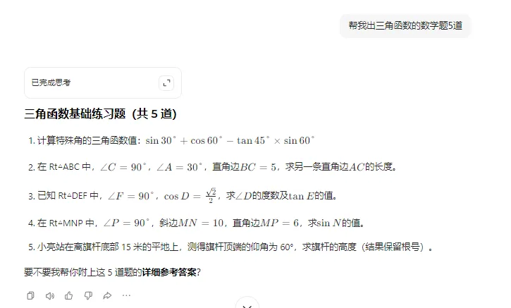 AI就会把题型告诉你,然后你跟AI说,你根据这些题型,每个题型帮我出五道题,这就出来了。是不是还很简单呢?