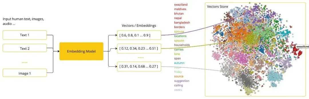 嵌入在实际应用中尤为重要,比如检索增强生成(RAG)模式。 它们使数据能够以语义空间中的点表示,类似于欧几里得几何的二维空间,但维度更高。 这意味着,就像欧几里得几何中平面上的点可以根据坐标近或远一样,在语义空间中,点的接近程度反映了意义上的相似性。 关于相似主题的句子在这个多维空间中被更靠近地排列,就像图中彼此靠近的点一样。 这种接近性有助于文本分类、语义搜索甚至产品推荐等任务,因为它使人工智能能够根据相关概念在扩展语义环境中的“位置”来识别和分组。