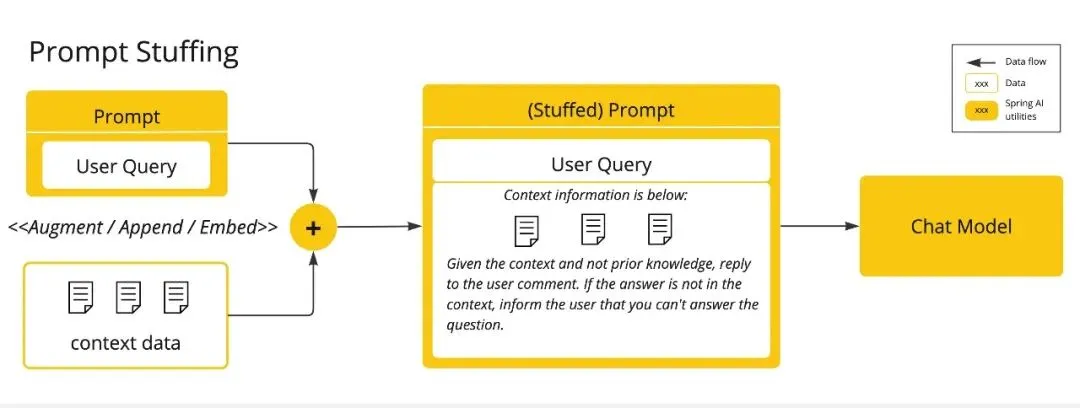 提示填充:更实用的替代方案是将你的数据嵌入模型提示中。鉴于模型的Tokens限制,需要技术在模型的上下文窗口内呈现相关数据。 这种方法俗称为“塞满提示”。 Spring AI库帮助你基于“填充提示”技术(也称为检索增强生成,RAG)实现解决方案。