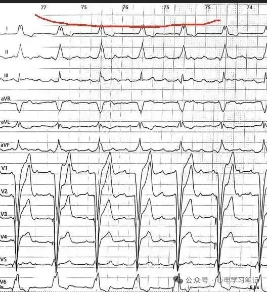一.考虑为PMT起搏器频率依赖性心动过速,有可能心室起搏逆传P,被心房感知,触发规律VP起搏,这时下壁导联P是个负向波,周而复始,行成折返环路!