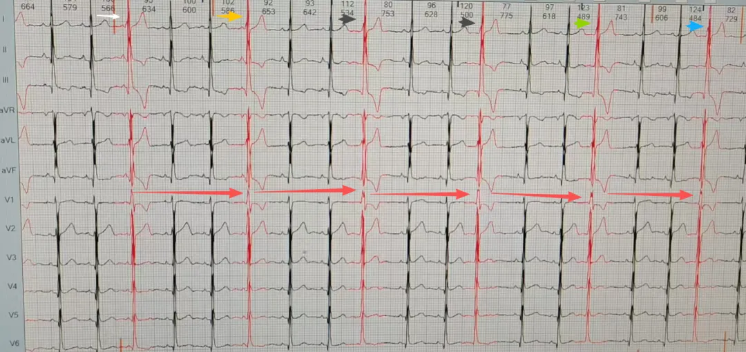 1. 联律间期不固定,上面小箭头的数字之间相差80以上,伙伴们可以自己算算。