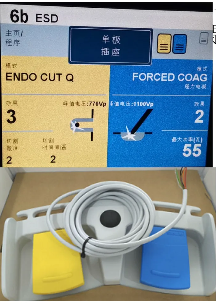 作为消化内镜医生,几乎每天都在跟高频电刀接触,但实事求是的讲对高频电的了解却很少,十几年的工作中对于电刀的参数设置几乎没动过,都是助手帮忙调整到厂家预设的一些参数,之前也自己从网络上学习过一些资料或者课件,好多的讲解也是大同小异,还是不明白、不理解,参数还是不敢调,最近又重新翻了一些资料,方便自己理解的同时也希望能对大家有所帮助。内容主要包括以下几个方面,第一部分包括前三项内容:一.脚踏与参数调节对应问题; 二.高频电中涉及的一些基本原理三.单极模式下常用的切开与电凝模式有哪些; 四.电切/电凝模式的参数调节有哪些,及不同参数调节对应的效应五.几种基础模式的简单解读; 六.附常用的参数设置一、脚踏与参数的对应问题(虽然问题很low,但相当长一段时间不知道) 以爱尔博的高频电刀(目前应该是用的最多)为例,屏幕中黄色部分的参数调整对应的是黄色脚踏(即我们所说的电切),蓝色区域的参数对应蓝色脚踏(即我们所说的电凝),不能通过调整蓝色区域中的电凝参数(如最大功率)去改变你踩黄色脚踏的电切效果。1.组织遇热后的变化:从汽化到碳化