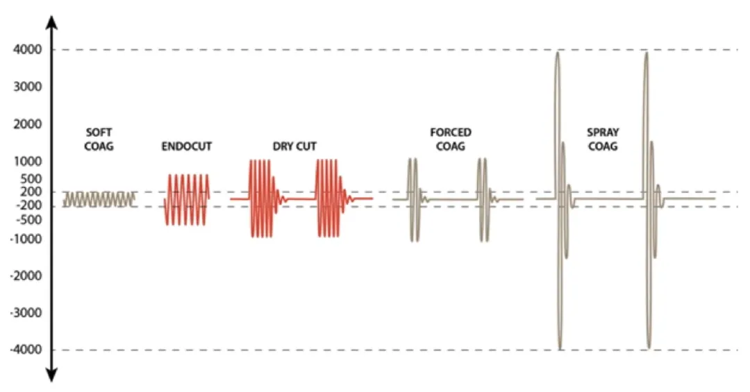 | 纵轴为峰值电压,不同模式电压不同,柔和电凝电压最小,小于200v几乎无切割功能,喷射电凝电压最高,可达数千V,可以产生长电弧 |