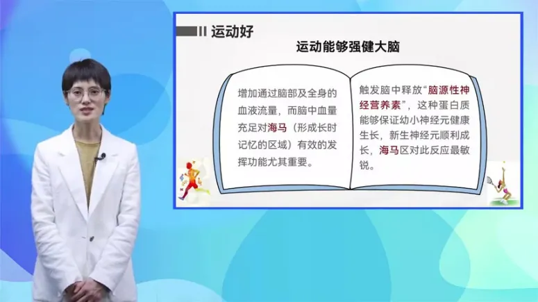 脑中血量充足,对于大脑中与形成记忆有关的结构体海马体而言非常重要,能够使其更加有效地发挥功能。其次运动还会触发大脑产生一种叫做脑源性神经营养因子的物质,这种蛋白质能滋养神经发育,保证幼小神经元健康生长,巩固新生神经元之间的连接,保护大脑,特别是负责记忆的海马体,不受压力激素的过度影响,当然这些有运动促发的幼小神经元细胞,在新生后的4个星期内非常脆弱,如果没有得到恰当的刺激,就很可能死亡。