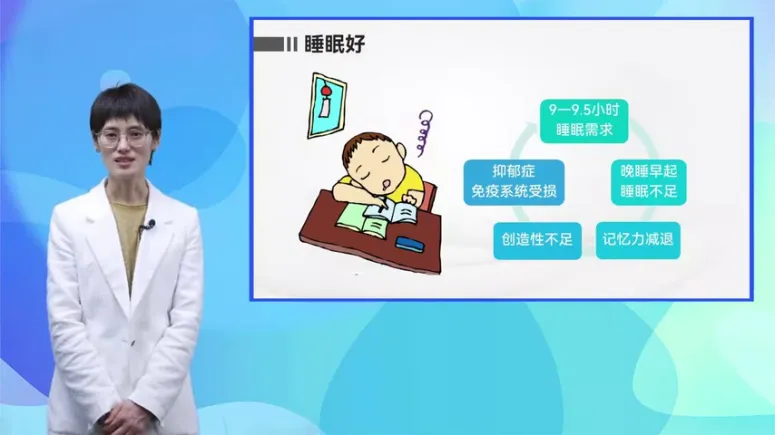 最后我们也需要了解,大脑不能长时间保持注意力高度集中,因此要提醒儿童青少年在学习一段时间之后需要适当休息,可以离开座位,来回走动,也可以眺望远方或者看看绿色植物,还可以做一些简单的放松操,通过活动肩部改善脑部的供血情况。第三是睡眠好,我们会发现青春期的孩子晚上不愿意睡觉,早上又不肯起床,在成年人看来,这就是青少年贪玩懒惰的表现。不少父母可能还为此严厉地批评过孩子,但从脑科学的角度来看,这也许错怪了他们。