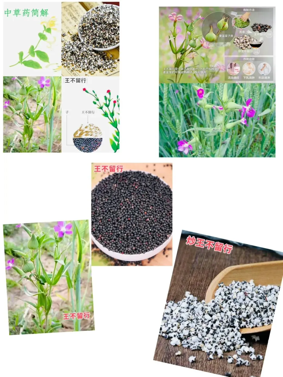 见到爆花状白絮 → 炒王不留行(生品为小黑球)。