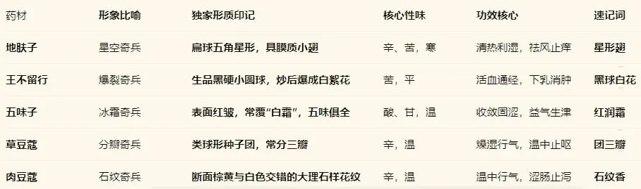 肉蔻石纹温中涩,五兵形态各通灵。