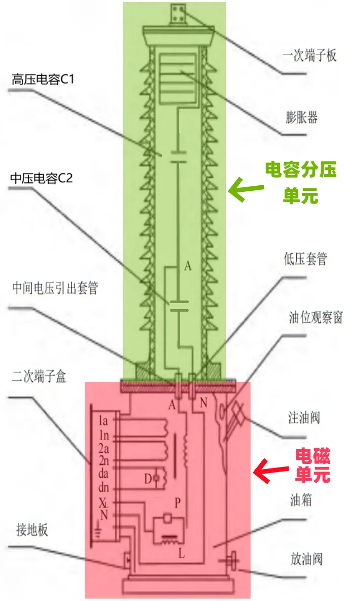 1、电容式电压互感器:俗称CVT,其原理是利用电容分压单元对一次侧电压进行降压,得到中间电压(一般为10-20 kV);再通过电磁单元,将中间电压降成二次侧电压。CVT主要由两大部分构成:电容分压单元(核心组件是电容分压器,包括高压电容C1和中压电容C2)和电磁单元(核心组件是中间变压器、补偿电抗器和阻尼装置),如下结构图所示。