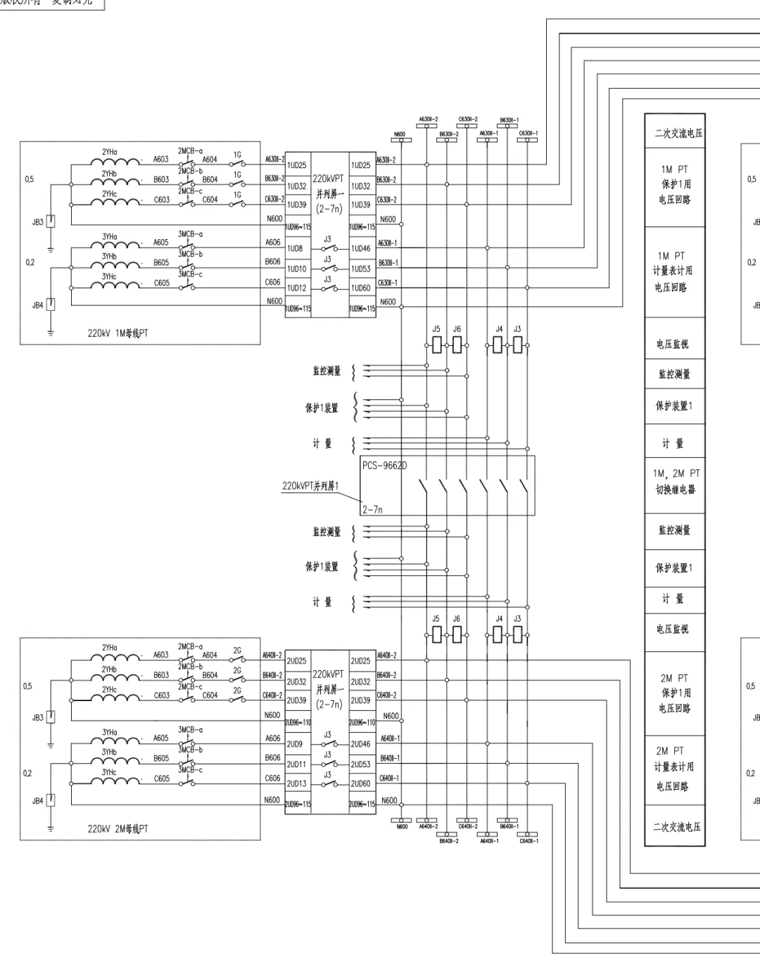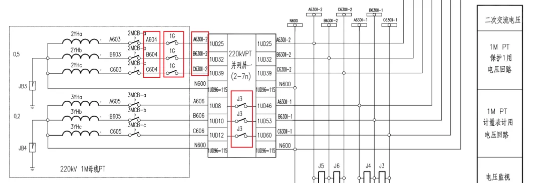 如上图所示,PT二次回路经过接线盒-->分相空气开关-->刀闸的辅助节点604-->PT并列屏A630II-2。(计量接重动继电器,因为保护相对更重要,所以接辅助接点更可靠,可以防止重动继电器出现粘连现象,而计量采用继电器更主要是为了防止辅助接点不够)