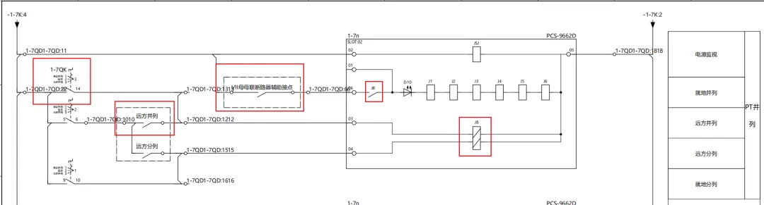 当一次测1 2M母联刀闸和断路器合位,则图中母联断路器辅助接点合上。然后允许并列把手1-7QK打到允许并列。此时可以执行就地和远方并列指令,这J8双位置继电器得电,并列回路导通,J1-6并列继电器得电。则并列回路导通,II母的二次电压通过并列装置送到I母的线路的装置上。四、电压切换。