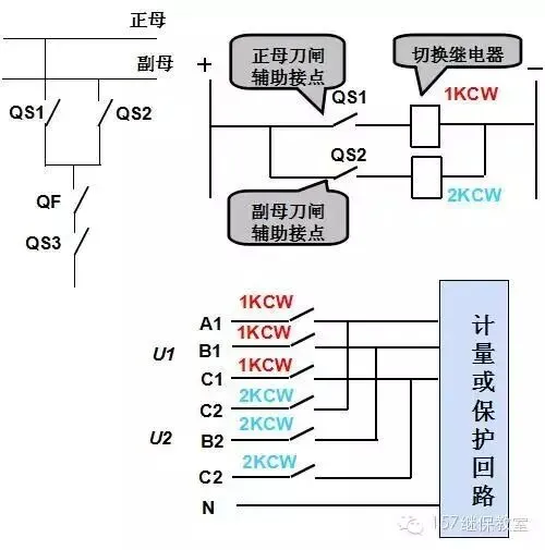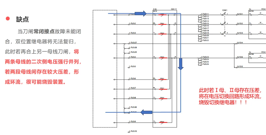 电压切换主要适用于双母线,单母分段没有切换回路。双母接线时,正副母线分列运行。某条线路运行在哪条母线上,二次就相应使用哪条母线PT的电压。当运行人员对一次隔离开关进行切换时,二次电压也要能自动切换。这就是电压切换,通过电压切换装置来实现。两段母线的电压通过并列屏(A 630/A 640)送到保护屏的电压切换装置。然后经过电压切换后将切换后的电压给保护、测量、安稳、备自投等使用。双位置继电器:有动作线圈和返回线圈,返回线圈的主要作用是当刀闸辅助接点回路出现掉电时电压切换回路仍能向保护装置提供掉电前的正常母线电压。也就是说继电器保持断电前的状态。当I母刀闸合,II母刀闸分,则1YQJ2-5动作,2YQJ2-5复归。在倒母操作分开刀闸时,若刀闸的常闭接点及回路出现异常时未能使原来动作着的双位置继电器返回,那么虽然一次设备已经脱离了原来所挂的母线,但二次电压切换主回路仍将该母线二次电压切换至保护装置,并与另一段母线的二次电压处于并列状态。如果未及时发现,当进行母线的分列操作时将出现母线二次电压的异常并列,可能烧毁电压切换主回路上薄弱的节点并造成电压回路异常(PT断线)。两个重要信号