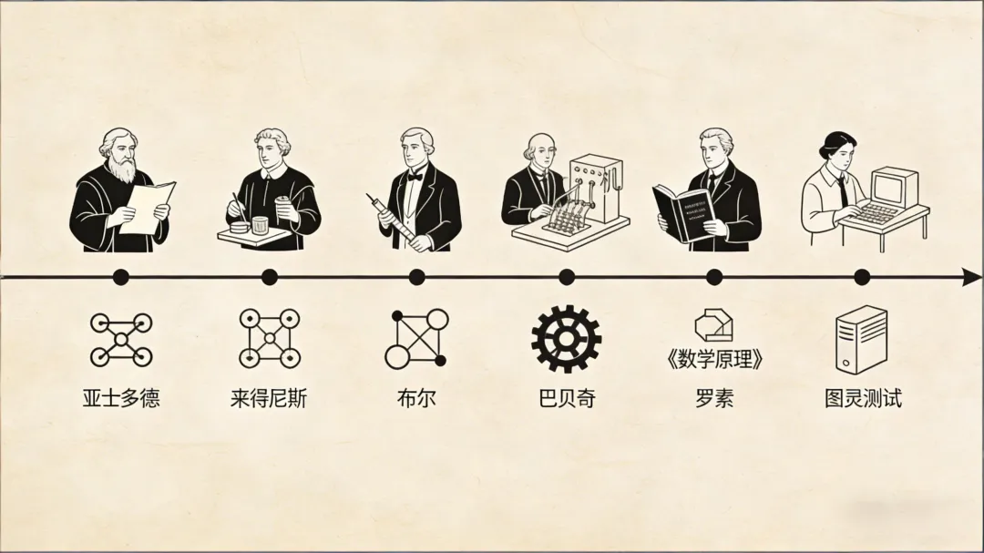 AI 的思想渊源:亚里士多德的形式逻辑、莱布尼兹的推理演算、图灵测试的定义;