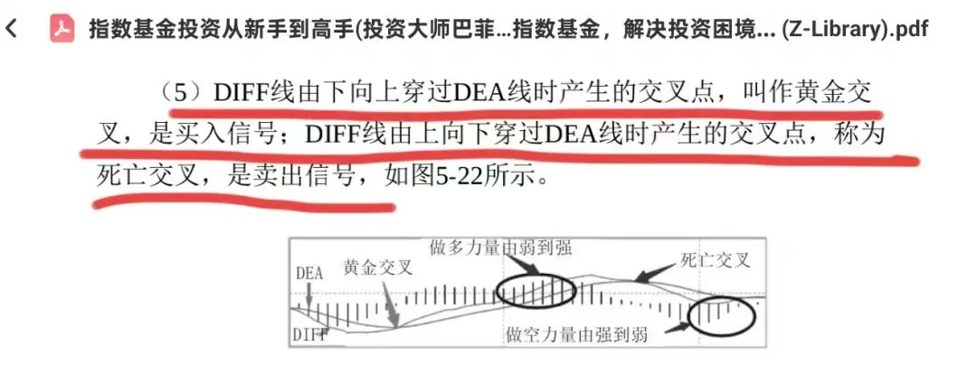 1.精读《指数基金从新手到高手》,总算把金叉、死叉讲得明明白白,帮我打通了任督二脉。MACD 的金叉(买入信号)是短期均线(DIF)上穿长期均线(DEA),死叉(卖出信