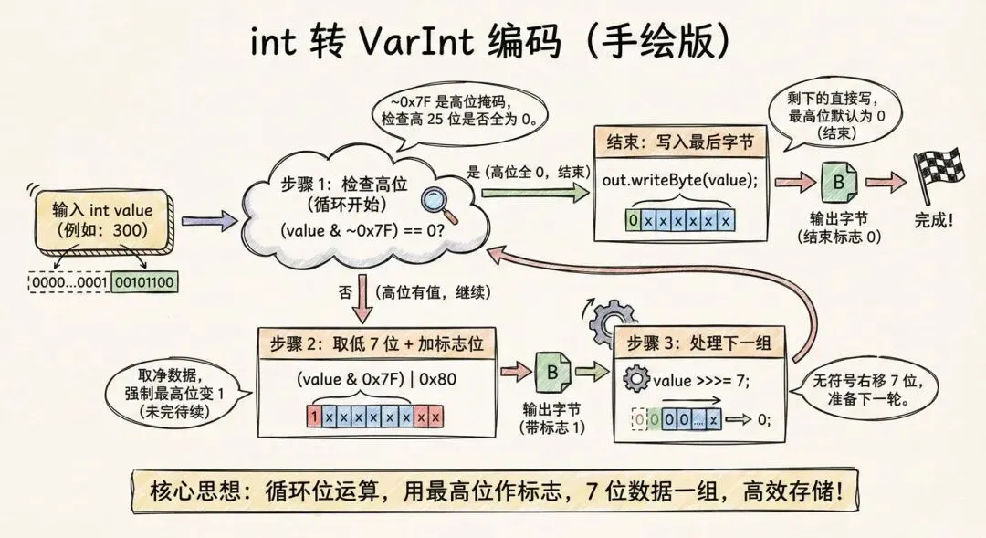 public void writeVarInt(DataOutputStream out, int value) { while (true) { // 1. 检查是否只剩最后 7 位 // ~0x7F 是高位掩码,用于检查高位是否还有值 if ((value & ~0x7F) == 0) { out.writeByte(value); // 剩下的直接写,最高位默认为0 (结束) return; } // 2. 取低7位 + 加上标志位 // (value & 0x7F) -> 取净数据 // | 0x80 -> 强制把最高位变1 (表示未完待续) out.writeByte((value & 0x7F) | 0x80); // 3. 处理下一组 value >>>= 7; // 无符号右移7位 }}