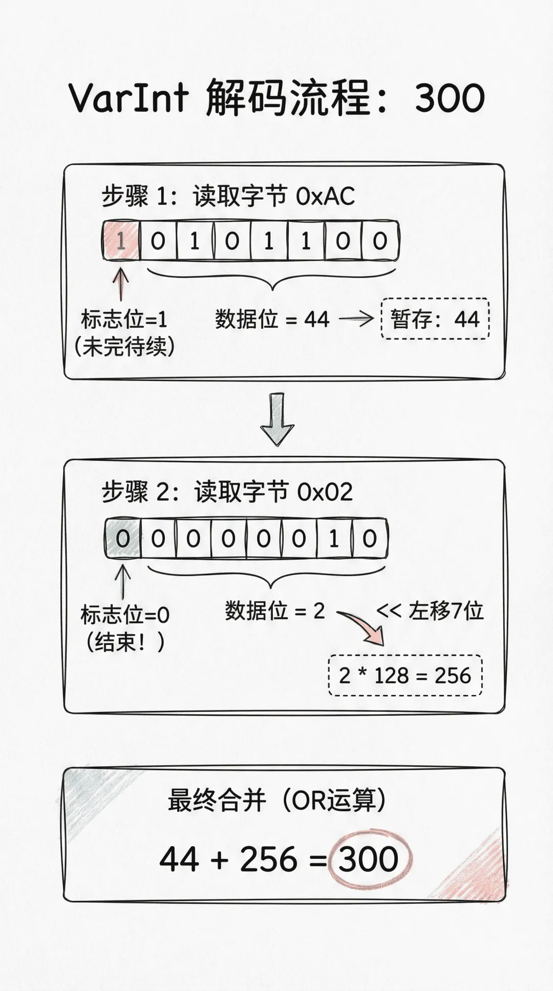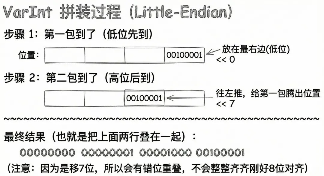 public int readVarInt(DataInputStream in) { int value = 0; int position = 0; // 位移量:0, 7, 14... byte currentByte; while (true) { currentByte = in.readByte(); // 1. 剥壳并归位 // (currentByte & 0x7F) -> 去掉标志位,只拿数据 // << position -> 放到对应的权重位置 (0是最低位) value |= (currentByte & 0x7F) << position; // 2. 检查结束标志 (最高位是否为0) if ((currentByte & 0x80) == 0) break; // 3. 准备下一层 position += 7; if (position >= 32) throw new RuntimeException("VarInt too big"); } return value;}